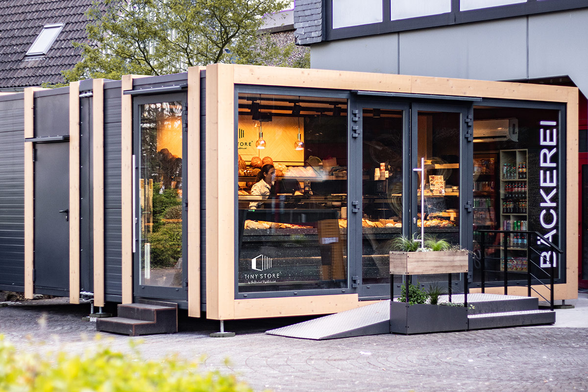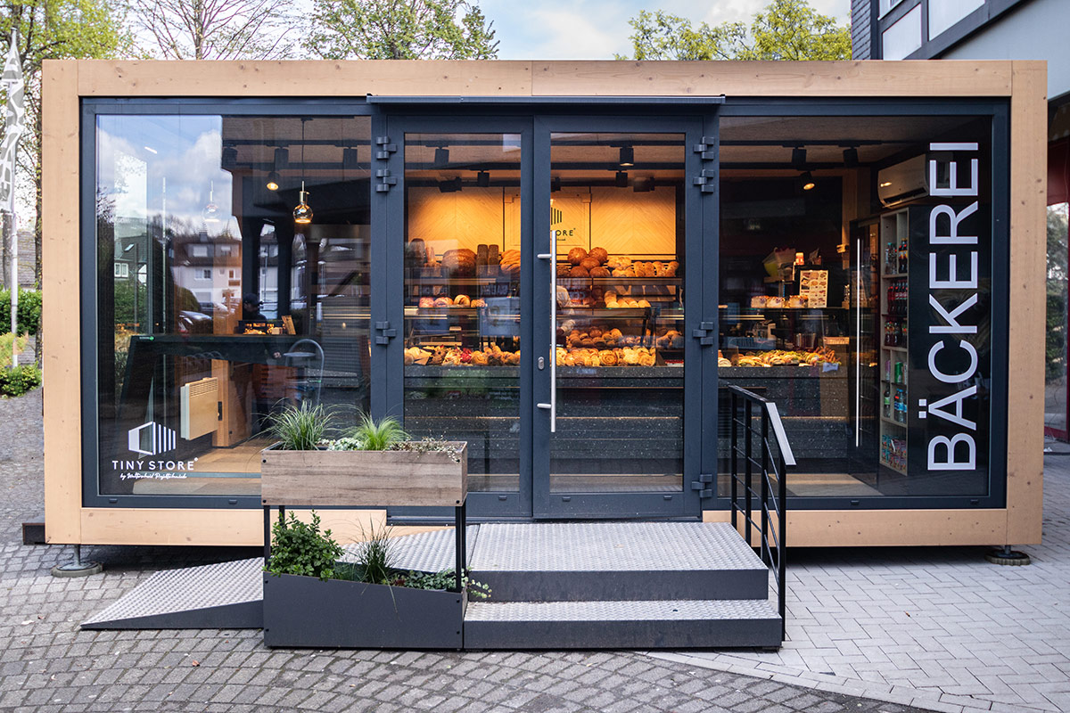 Eine 6 x 6 Meter große, mobile Bäckereifiliale, bestehend aus zwei nahtlos verbundenen Containern.