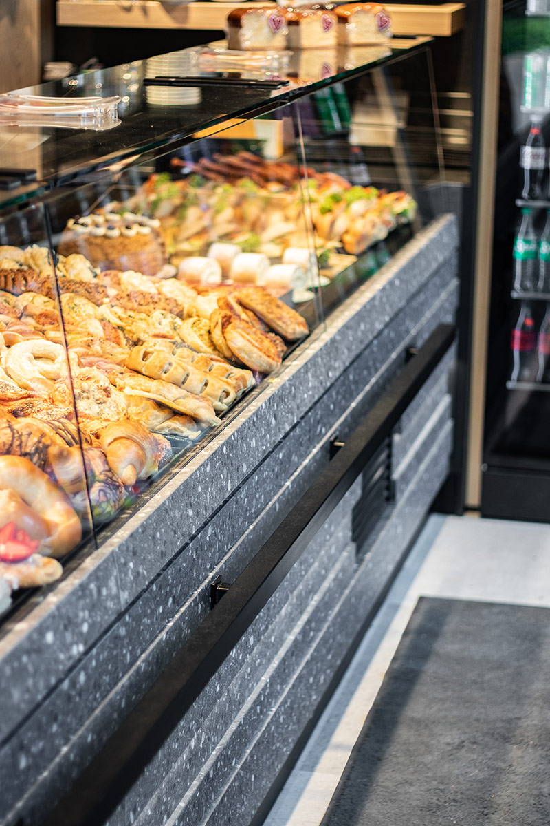Voll ausgestattete Thekenanlage inklusive integriertem Getränkekühlschrank für Impulskäufe.