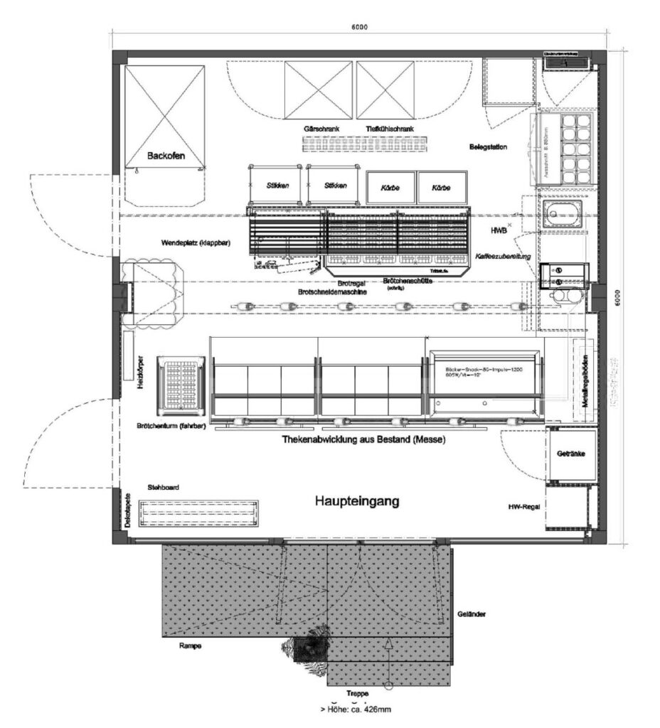 Auf dem Grundriss wird die Stärke der zwei Module sofort sichtbar: Vorne befindet sich die großzügige Verkaufsbühne mit weiter Fensterfront, einladender Theke und dem Design-Stehboard für Ihre Gäste. Hinten liegt das unsichtbare Kraftzentrum – Ihr durchdachter Lager- und Vorbereitungsbereich. Durch die clevere Positionierung von Ofenstellplatz und Snack-Station (Saladette) ermöglichen wir Ihren Mitarbeitern ergonomische, kurze Wege. So garantieren Sie maximale Frische, ohne dass Unruhe im Kundenbereich entsteht.