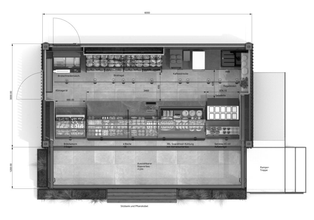 Wie macht man aus einem kompakten Container eine einladende Filiale, in der Kunden auch bei Regen gerne verweilen? Der Tiny Store Single 2 liefert die Antwort durch clevere Ingenieurskunst: Die Längsseite lässt sich um 1,2 Meter ausziehen. So entsteht aus der 3 x 6 Meter großen Basis im Handumdrehen eine erweiterte Grundfläche von 4,2 x 6 Metern. Das Ergebnis: Ein echter, wettergeschützter Kundenraum direkt vor der Theke. Schnell aufstellbar, flexibel einsetzbar und ein optisches Highlight an jedem Standort.