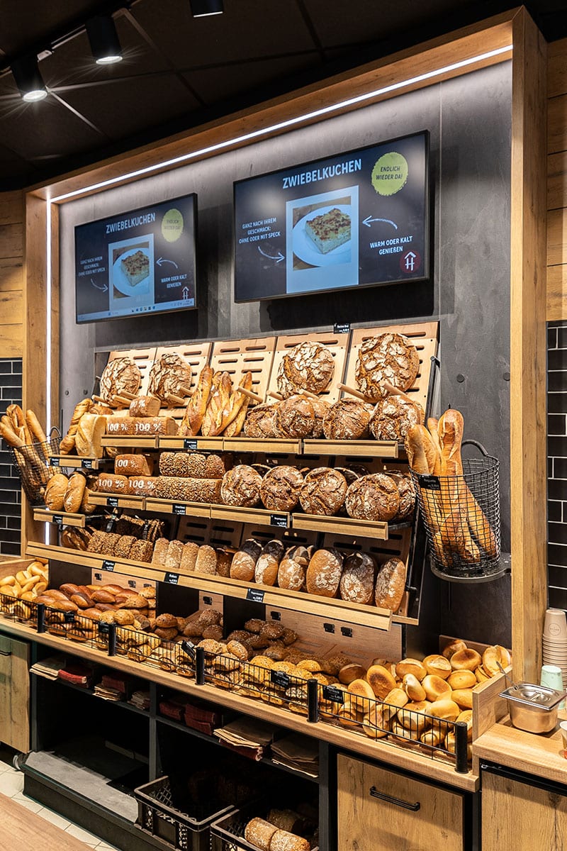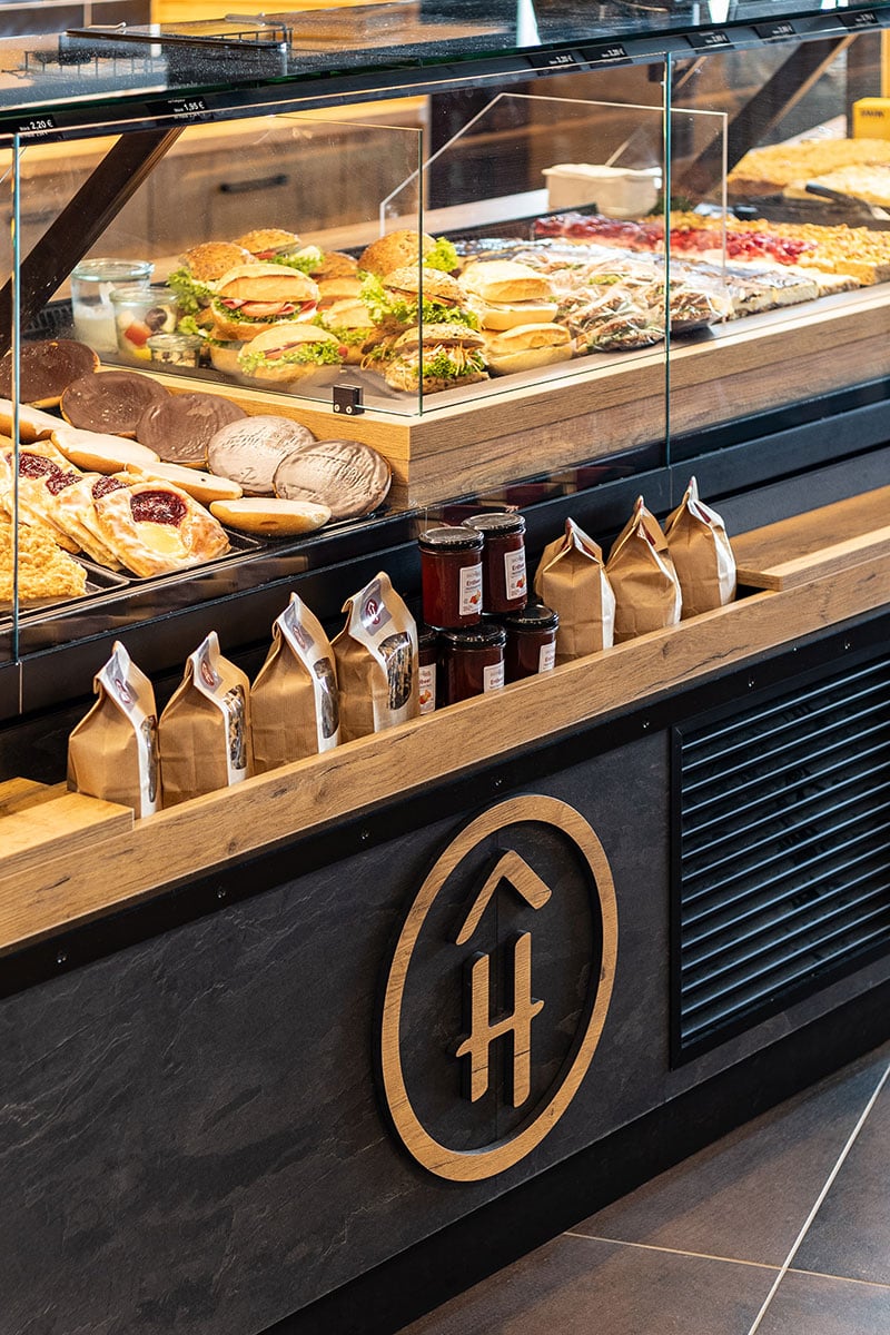 Wir freuen uns, die neue Filiale der Bäckerei Heislitz im Rewe Liederbach präsentieren zu dürfen. Das durchdachte Filialkonzept überzeugt mit zahlreichen Highlights und verbindet Funktionalität, Emotion und Ästhetik auf höchstem Niveau. Die Wahl der Materialien spielt eine zentrale Rolle im Design: ausdrucksstarke Eiche, Schieferplatten und vintage Fliesen in Schwarz verleihen der Filiale ein modernes Industriedesign mit zeitgemäßem Charakter. Besondere Aufmerksamkeit verdient die Verkaufstheke, die nicht nur ästhetisch ansprechend gestaltet ist, sondern auch mit zahlreichen funktionalen Eigenschaften überzeugt. Beispielsweise einer Taschenablage, die bei Bedarf als Handelswaren-Verkaufsfläche genutzt werden kann oder die integrierten Bezahlautomaten der Firma Cash-Logy, welche den Bezahlvorgang erleichtern, Verluste verhindern und für einen reibungslosen Bezahlprozess sorgen. Ein weiteres Highlight der Filiale ist die speziell für die Bäckerei Heislitz entwickelte Walterscheid-Brotwand. Diese sorgt für eine optimale Warenpräsentation der vielfältigen Brotsorten.