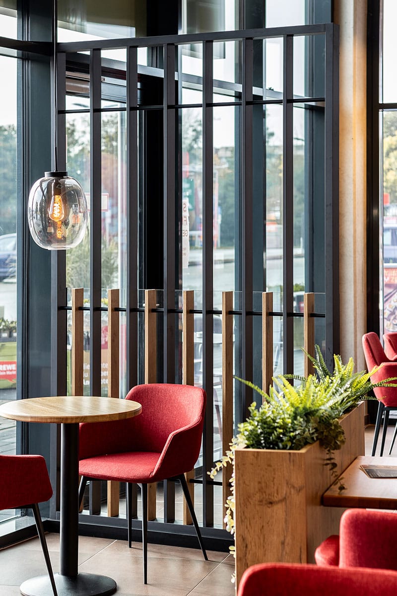 Die hohe, senkrechte Anordnung und das umlaufende LED-Licht machen die Brotwand bereits aus der Ferne sichtbar und setzen die Produkte gekonnt in Szene. Der gemütliche Sitzbereich lädt mit seiner außergewöhnlichen, gebogenen Wand-Deckenkonstruktion zum Verweilen ein und fungiert als echter Eyecatcher. Ergänzt wird das Interieur durch abstrakte Raumtrenner in Lamellenoptik sowie ein ausdrucksstarkes Beleuchtungskonzept mit stilvollen Pendelleuchten, die eine angenehme und moderne Atmosphäre schaffen. Wir bedanken uns bei der Bäckerei Heislitz für die vertrauensvolle Zusammenarbeit und sind stolz, Teil dieses Projektes zu sein. Gemeinsam haben wir einen Ort geschaffen, der das Einkaufserlebnis nachhaltig bereichert und die Freude am Genießen fördert.