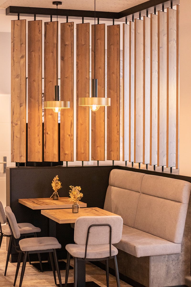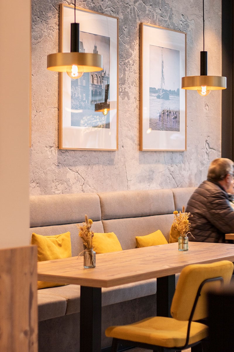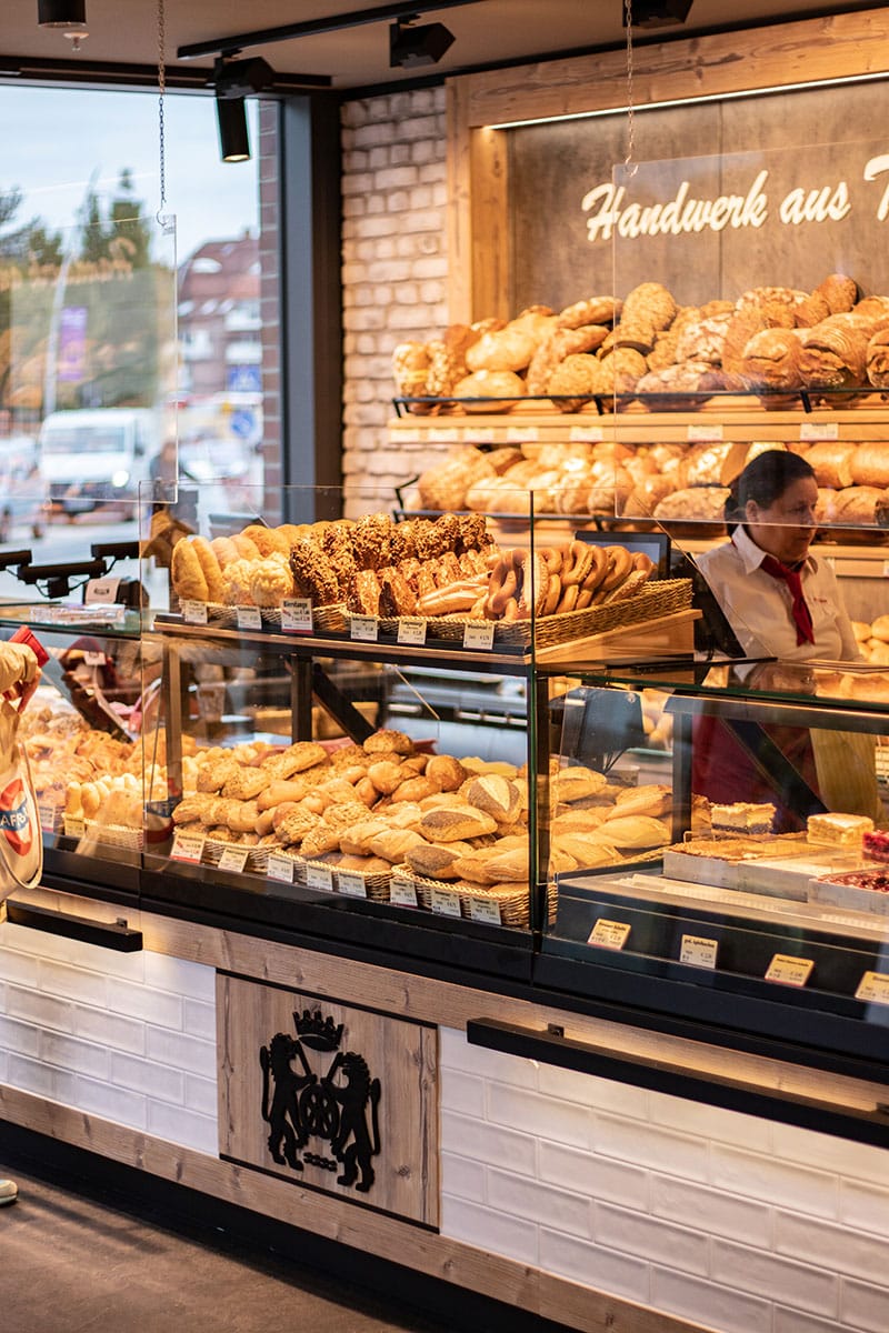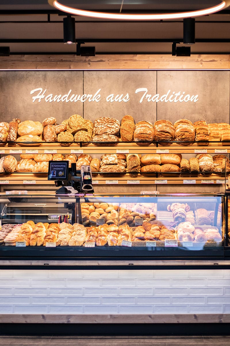 Eine 7,60 mtr. Theke, von der 2,40 mtr. gekühlt sind, bietet den Kunden eine optimale Sicht auf das reichhaltige Backwaren – Sortiment. Die gläserne Backstube, wie auch die Snackzubereitung, erlauben Einblicke in einzelne Arbeitsabläufe. Das moderne und stylische Ambiente bietet für den Genuss vor Ort 30 wertige, gemütliche Sitzmöbel im Café oder der Außenterrasse. Der richtige Ort, um bei einer Tasse Kaffee und einem leckeren Snack oder einem Stück Kuchen eine Shoppingpause einzulegen.