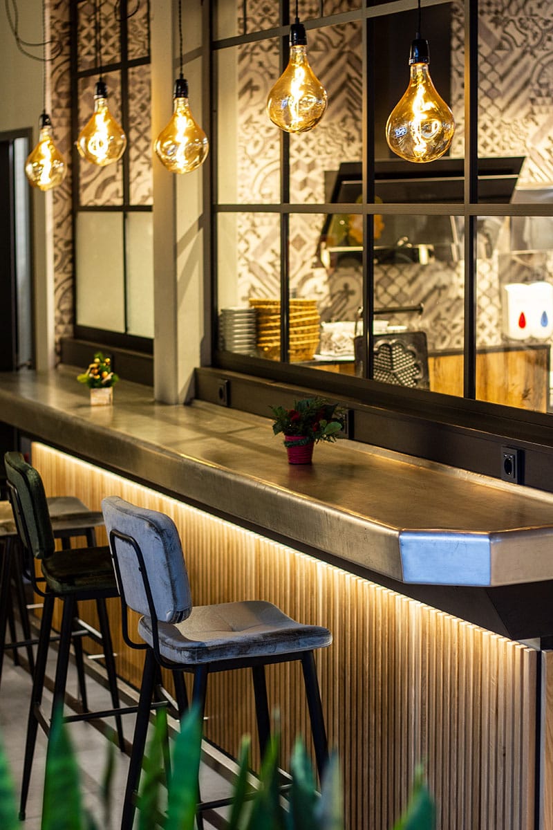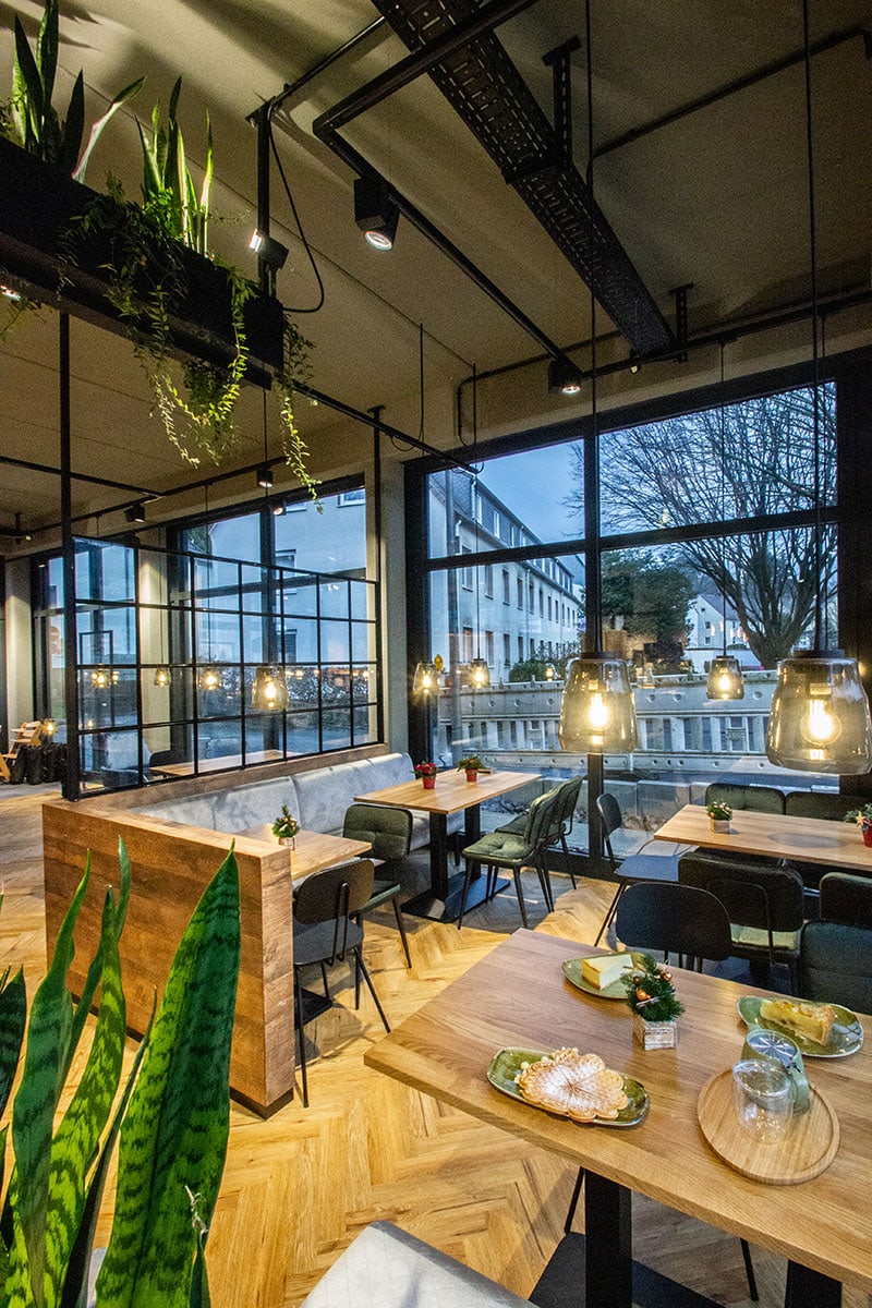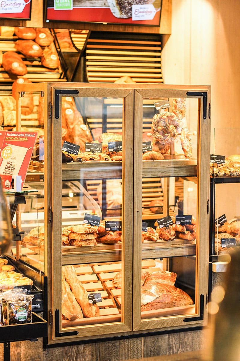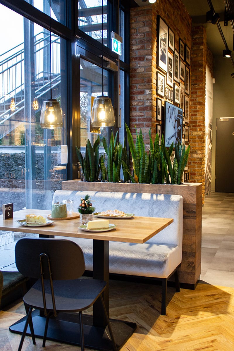 Herzstück der Abteilung ist eine dreietagige Kühlung, die immens viel Platz für die, in Zusammenarbeit mit TV- Koch Sebastian Lege, entstandenen Snacks bietet. Auch der Verzehrbereich der Traditionsbäckerei wurde mit einem neuen Erscheinungsbild versehen. Ein gemütlich anmutender Industriestil mit Retrocharme bestimmt nun die Optik des Cafés. Viel warmes Holz, Ziegelsteine und Industriefenster werden gepaart mit Möbeln im Midcentury Style. Eines der vielen ästhetischen Highlights ist die 4,5m lange, aufwendig geformte Zinn- Bartheke, welche seitlich an dem Verkaufsbereich anschließt und regelrecht zum Verweilen einlädt. Auf der oberen Etage des zwei- stöckigen Freestanders befindet ein großzügiger Terassenbereich, der Platz für 40 Gäste bietet. Dieser kann aufgrund von intelligenter Heiztechnik ganzjährig genutzt werden.