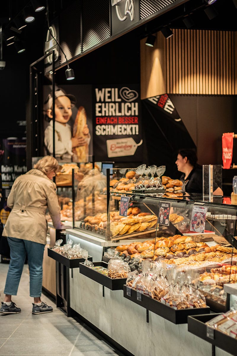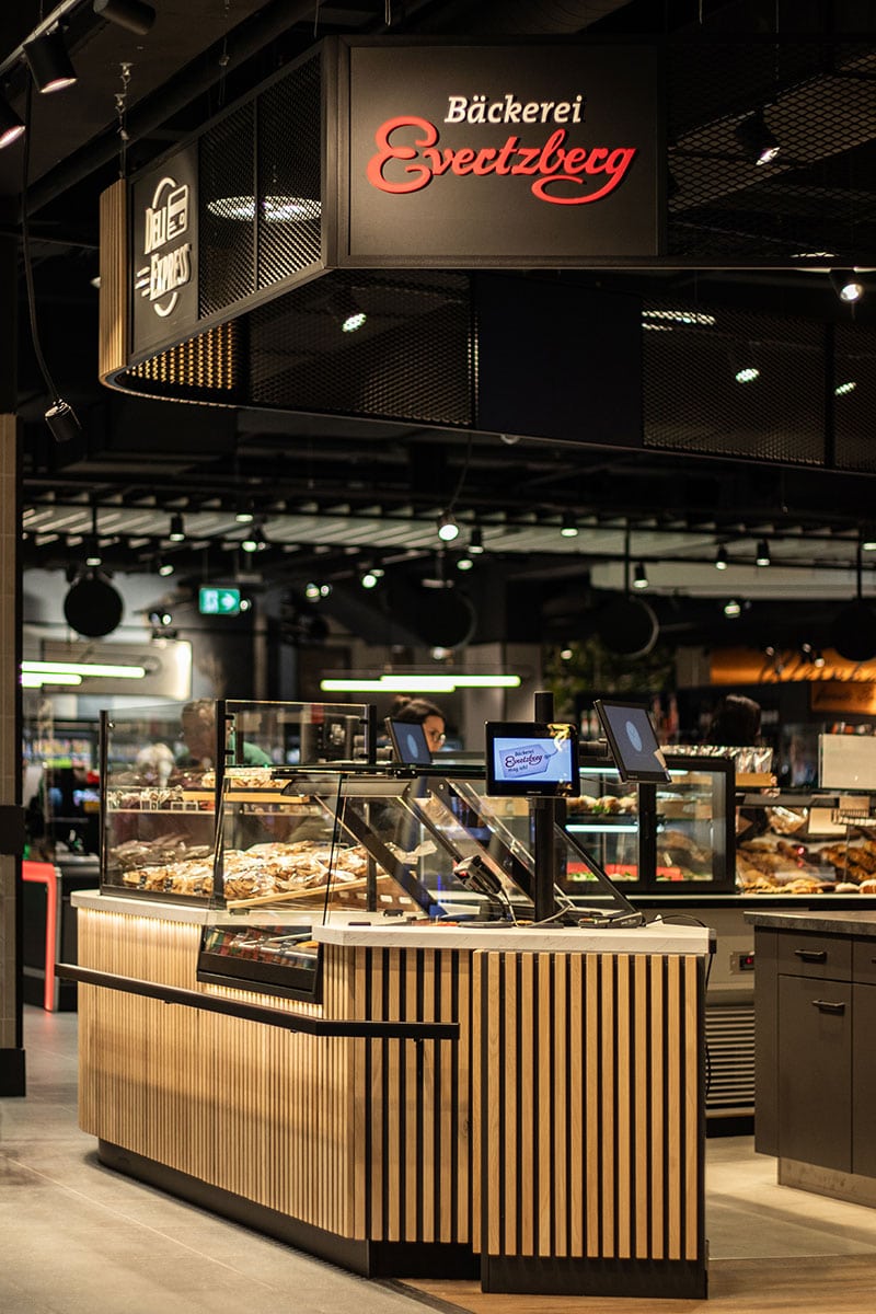 Angelehnt an Evertzberg´s Flagship – Store in der Fritz-Reuter-Straße wurde jetzt auch die Filiale der Bäckerei Evertzberg in der Vorkassenzone des Edeka Pauli im Allee-Center in Remscheid von der Walterscheid-Projektschmiede eingerichtet. Die hochwertige und großzügig gestaltete neue Filiale vereint zwei Schwerpunkte unter einem Dach: Bäcker – Kompetenz und Wohlfühlatmosphäre. Die Herausforderung an Kundenberater Tobias Schwanewilm bestand darin, das Flagship-Store- Konzept für diesen Standort zu implementieren und die Ware exzellent in Szene zu setzen. Diese Aufgabe wurde durch den Einsatz wertiger Materialien wie Massivholz und Metallkonstruktionen perfekt umgesetzt.