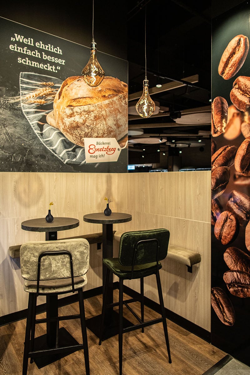Pulverbeschichtete Stahlrahmen mit Glasfüllung erlauben einen perfekten Einblick in den Vorbereitungs- und Backbereich. Neue Präsentationsflächen mit Massivholzrosten bieten einen hervorragenden Einblick auf die Produktpalette. High light ist die integrierte Brottheke mit vorgebautem Vertikal-Rollo, welches je nach Warendruck flexibel verändert werden kann. Auch hier wurden im Thekenbereich drei Bezahlautomaten berücksichtigt. So wurde mit viel Liebe zum Detail die neue Filiale der Bäckerei Evertzberg für die Zukunft gestaltet.