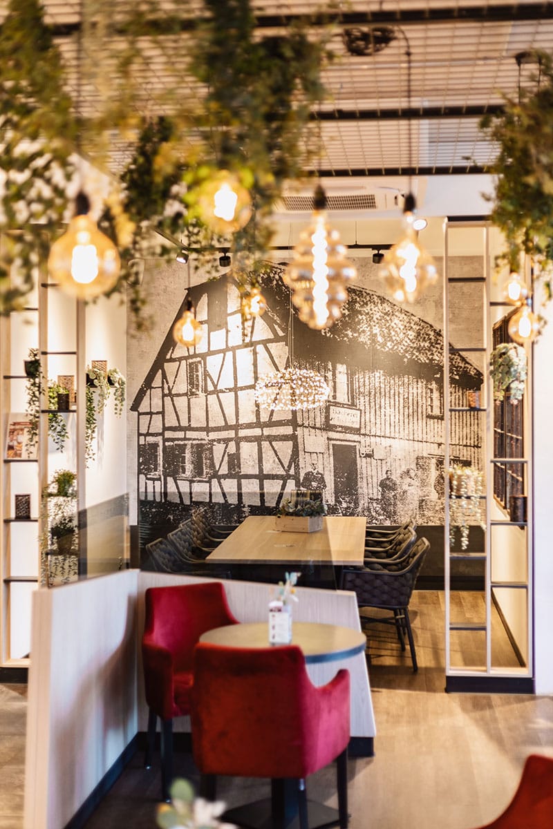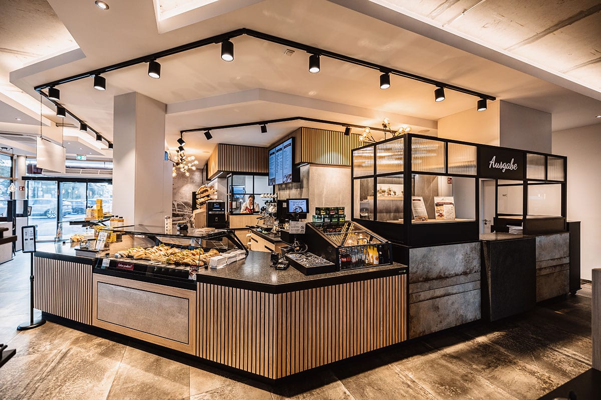 Auch die Wurzeln der Bäckerei sind präsent: Zwei großformatige Tapeten erzählen die Geschichte des Unternehmens – mit Abbildungen des Stammhauses und eines Gründerportraits samt Kutschenpferd. So wird Vergangenheit im neuen Ambiente sichtbar. Grüne Akzente an der Decke verleihen dem Raum eine natürliche Note. Durchdachte Details wie die Selbstbedienungsecke mit integrierter Getränkekühlung runden das Konzept ab und machen den Einkauf schnell und unkompliziert. So ist in Ittenbach ein Ort entstanden, der mehr ist als eine Verkaufsstelle: ein modernes Café mit Charakter, das Handwerkskunst, Geschichte und Wohlfühlatmosphäre gekonnt vereint.