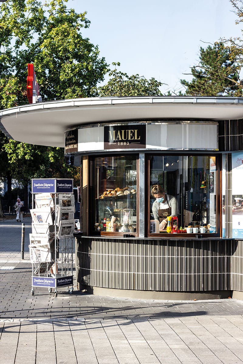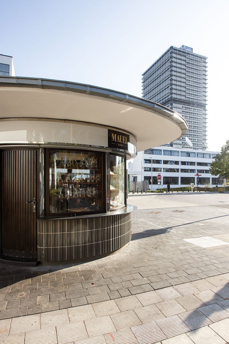 In Nierenform – 1957 gebaut – misst es gerade einmal 20 qm und ist ganz im Stil der 50er Jahre gebaut. Mit gefliestem Sockel und breitem Überdach schützt es Kunden vor Regen und Sonne. Der Verkaufsraum ist rundum verglast. Mit dem Regierungsumzug 1999 nach Berlin wurde 2006 das Bundesbüdchen im Ganzen entfernt und eingelagert. Nach 14 Jahren Einlagerung ist das Büdchen – rundum saniert – in die Heuss-allee 13, Ecke Platz der Vereinten Nationen, in Sichtweite des alten Standortes zurückgekehrt. Dank der Initiative des Fördervereins historischer Verkaufpavillon e.V. und namhafter Sponsoren. Die Walterscheid-Projektschmiede erhielt vom neuen Pächter – der Bäckerei Peter Mauel – den Komplettauftrag für den Innenausbau und die Einrichtung des neuen Bundesbüdchens. Die schwierige und vielschichtige Aufgabe bestand darin, den Spagat zwischen Denkmalschutz und Lebensmittelaufsicht zu realisieren und die Historie in das neue Einrichtungskonzept einfließen zu lassen. Durch die gute und konstruktive Zusammenarbeit des Walterscheid-Beraters Philipp Merdon mit Bäckermeister Peter Mauel entstand auf kleiner Fläche ein Pavillon, der keine Wünsche offen lässt.