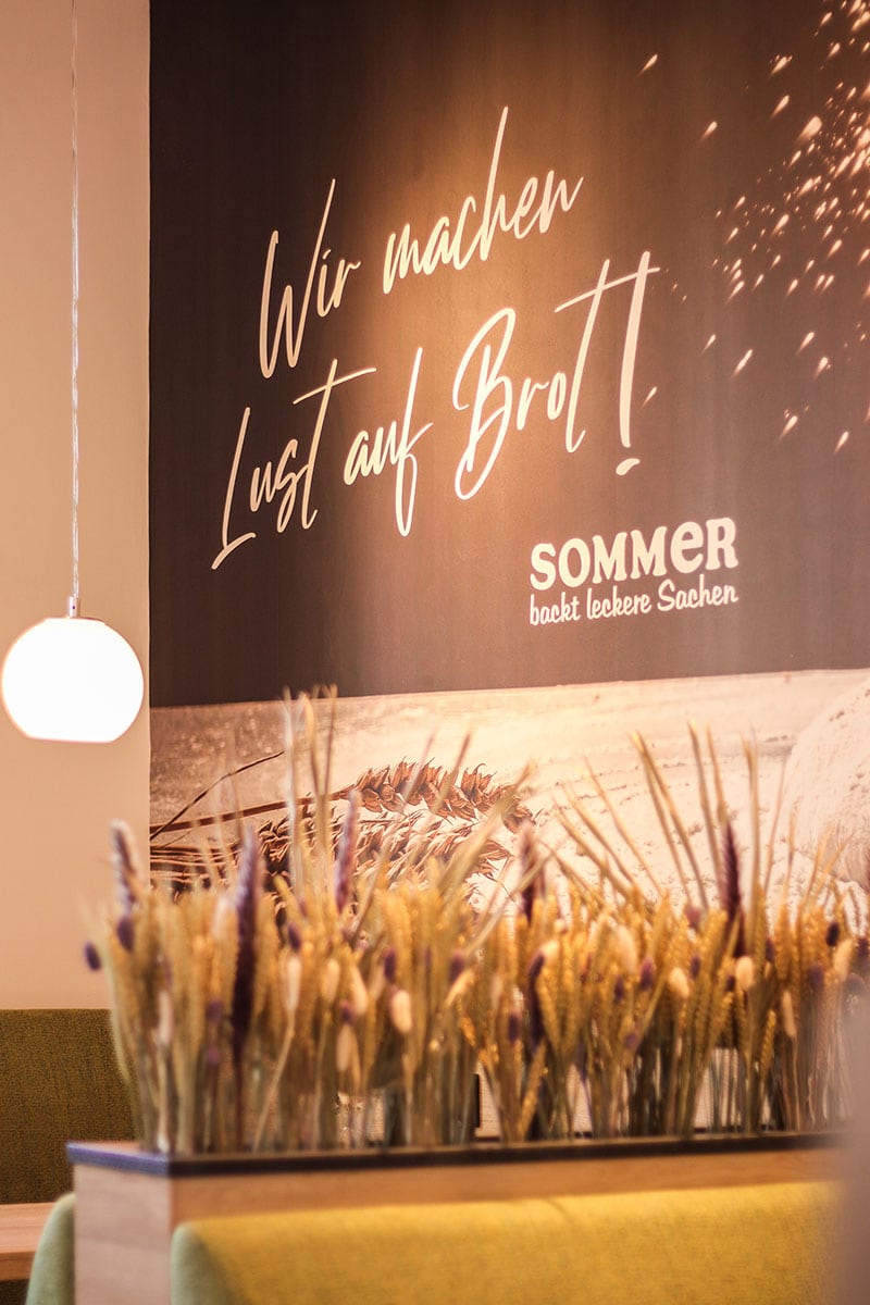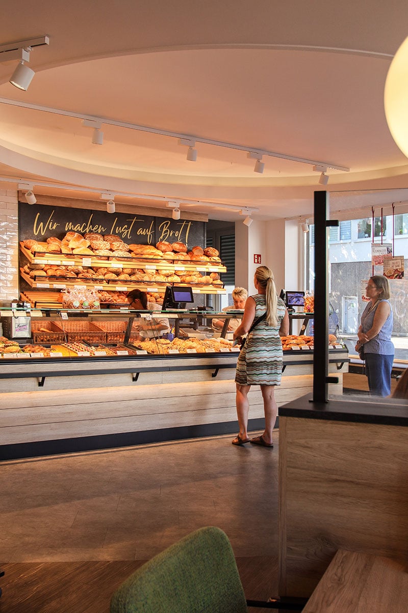 Auf 23 gemütlichen Sitzgelegenheiten können die Gäste, wie auch in den anderen Filialen, einen bäckertypischen Snack mit Brot, Brötchen und Eierspeisen oder auch leckere Konditoreiartikel bei einem Kaffee- oder Kaltgetränk genießen. Dezente Farbakzente in Form grüner Sitzpolster laden zum Verweilen ein. Einen optimalen Einblick auf das appetitlich präsentierte Backwarensortiment ermöglicht die stark angeschrägte Thekenfrontscheibe wie auch das 7 mtr. messende Brotregal. Ein großformatiges Leuchtbild, stimmungsvolle Fototapete mit dem Slogan sowie eine liebevoll arrangierte Dekoration schaffen ein Ambiente zum Wohlfühlen.