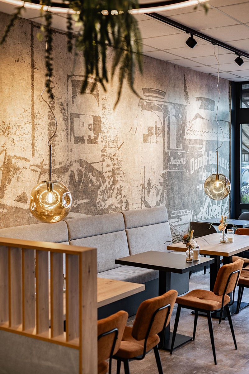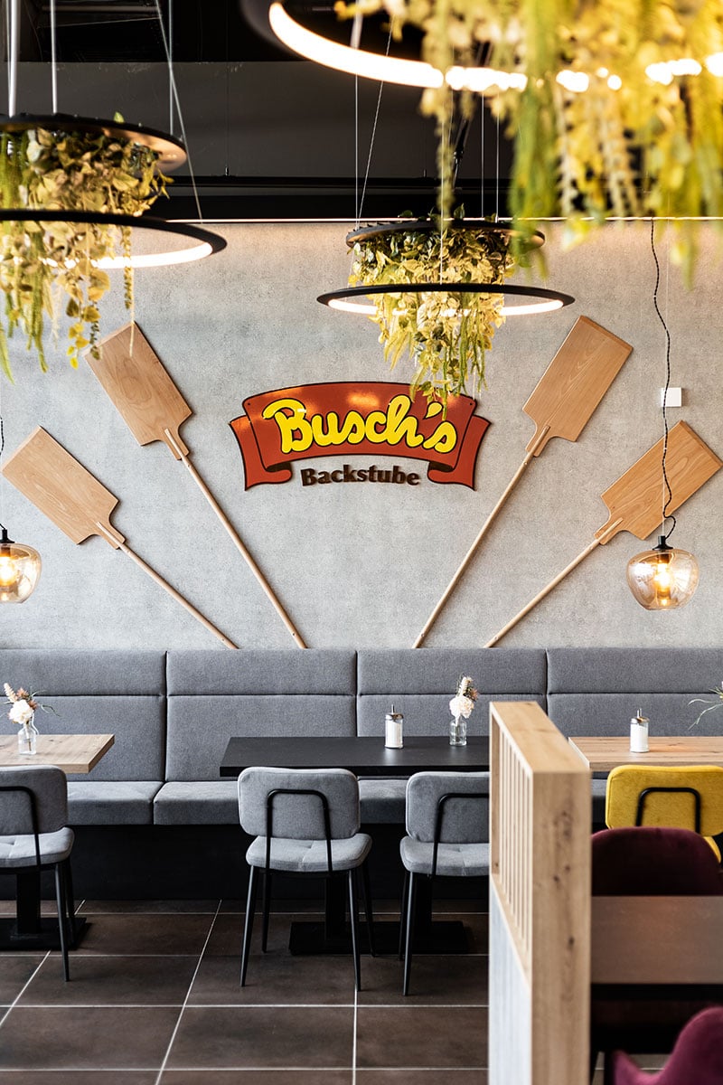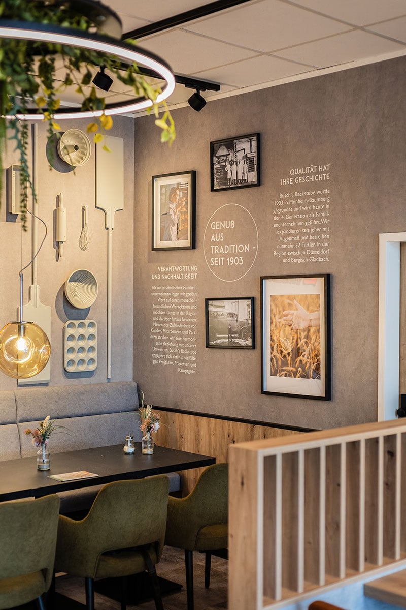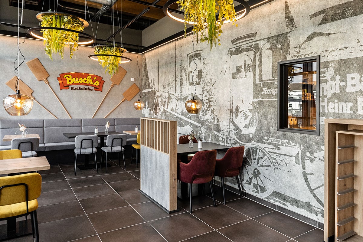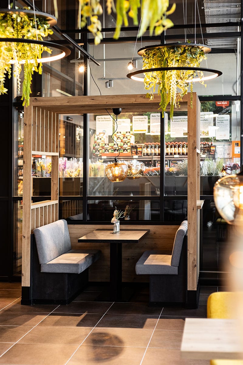 Der neu gestaltete Sitzbereich punktet mit durchdachter Raumwirkung: Eine kleine Häuschen-Nische bietet geschützten Platz für eine entspannte Auszeit. Großformatige Wandgrafiken in Betonoptik und dekorative Leuchtringe mit Begrünung setzen visuelle Highlights und schaffen eine moderne, einladende Atmosphäre. Parallel zum Neubauprojekt in Baumberg wurde auch der Sitzbereich der bestehenden Busch-Filiale im REWE Erkrath modernisiert. Die Einrichtung stammte aus dem Jahr 2014 und entsprach nicht mehr den aktuellen Anforderungen. Neben einer umfassenden Neugestaltung des Cafébereichs wurde die Thekenanlage um eine zusätzliche Snacktheke erweitert – als Reaktion auf die wachsende Nachfrage nach To-go-Angeboten. Auch hier haben wir das neue Erscheinungsbild der Bäckerei konsequent umgesetzt. Zwei Projekte, die zeigen: Durchdachte Funktionalität, hochwertiges Design und kundenorientierte Lösungen können im Ladenbau eine starke Verbindung eingehen.