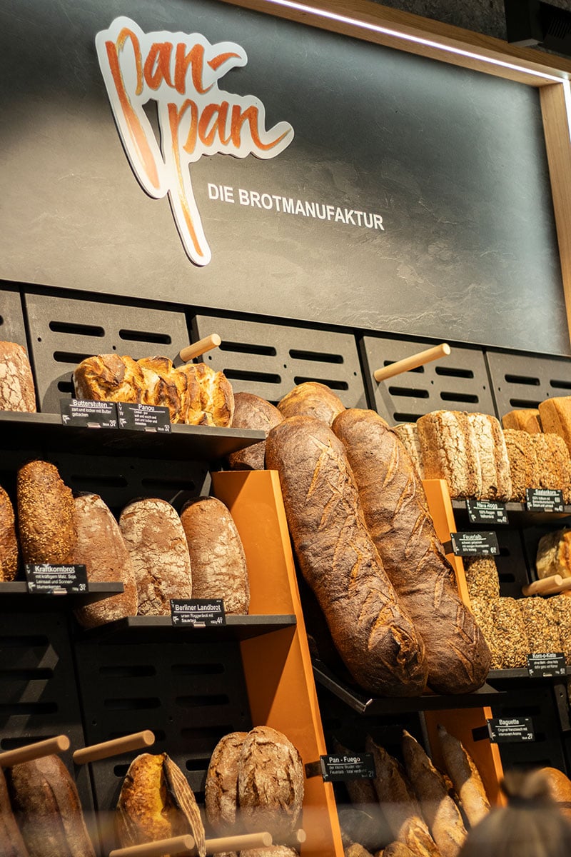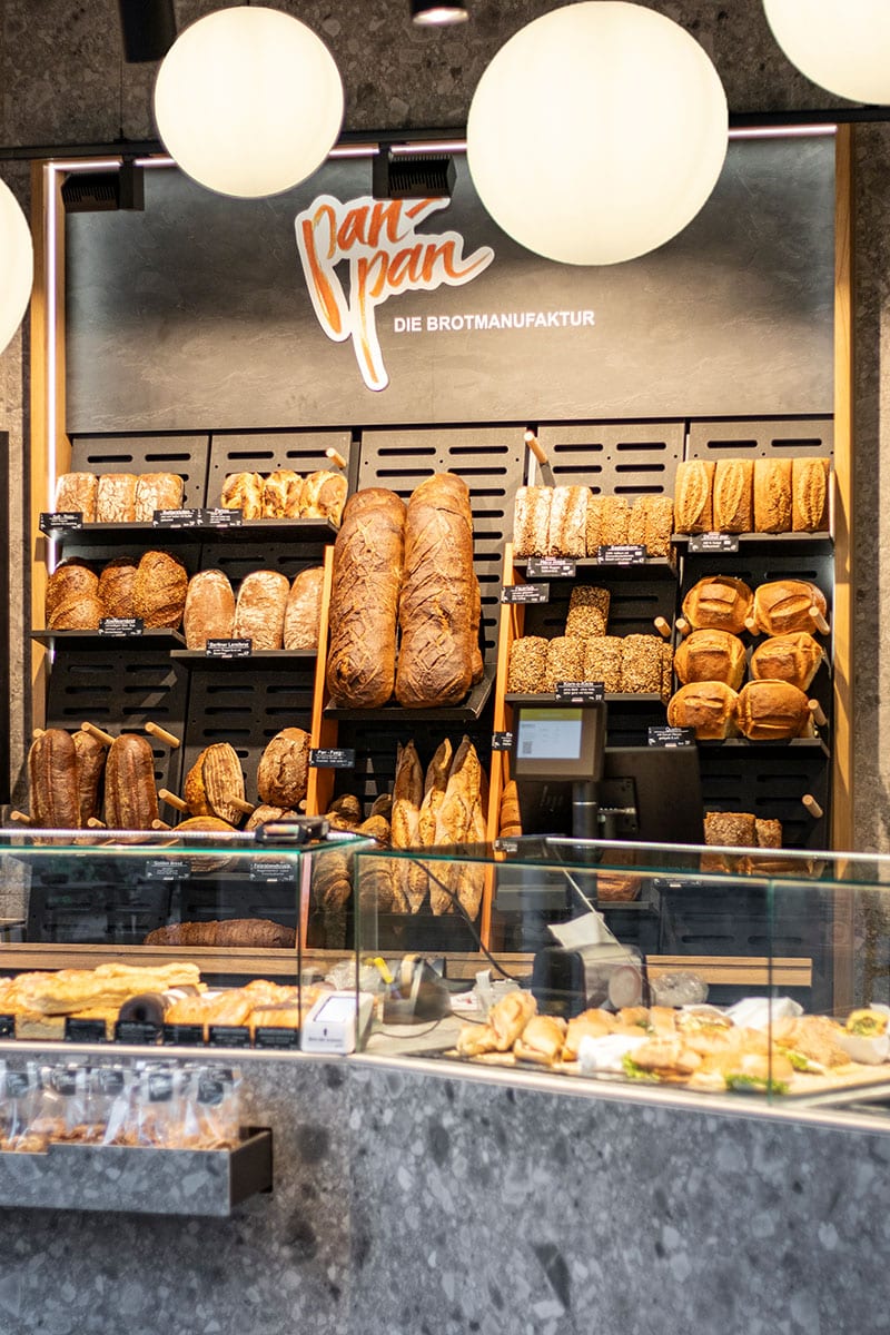 Mit diesem „Natural Design – Konzept“ beweist die Walterscheid – Projektschmiede einmal mehr ihre Kompetenz als Spezialist für individuell geplante Gesamtlösungen bei der Vermarktung und Inszenierung handwerklich gefertigter Backwaren. Für die neue panpan Brotmanufaktur in Bielstein kreierten Dipl.-Designer Andre Walterscheid und Kundenberater Schwanewilm ein stylisches Konzept, welches Jung und Alt anspricht. Einbauten und Exponate in Eiche Massivholz und gesintertem Stein, kombiniert mit dekorativen Pflanzen laden zu einer Pause im hektischen Arbeitsalltag, ob zum Treff mit netten Menschen oder zum Auftanken frischer Kräfte ein. Für Impulskäufe wurde in der geschwungenen, aus modernem Terrazzo-Stein gearbeiteten Thekenfront ausgefräste Schubkästen integriert.